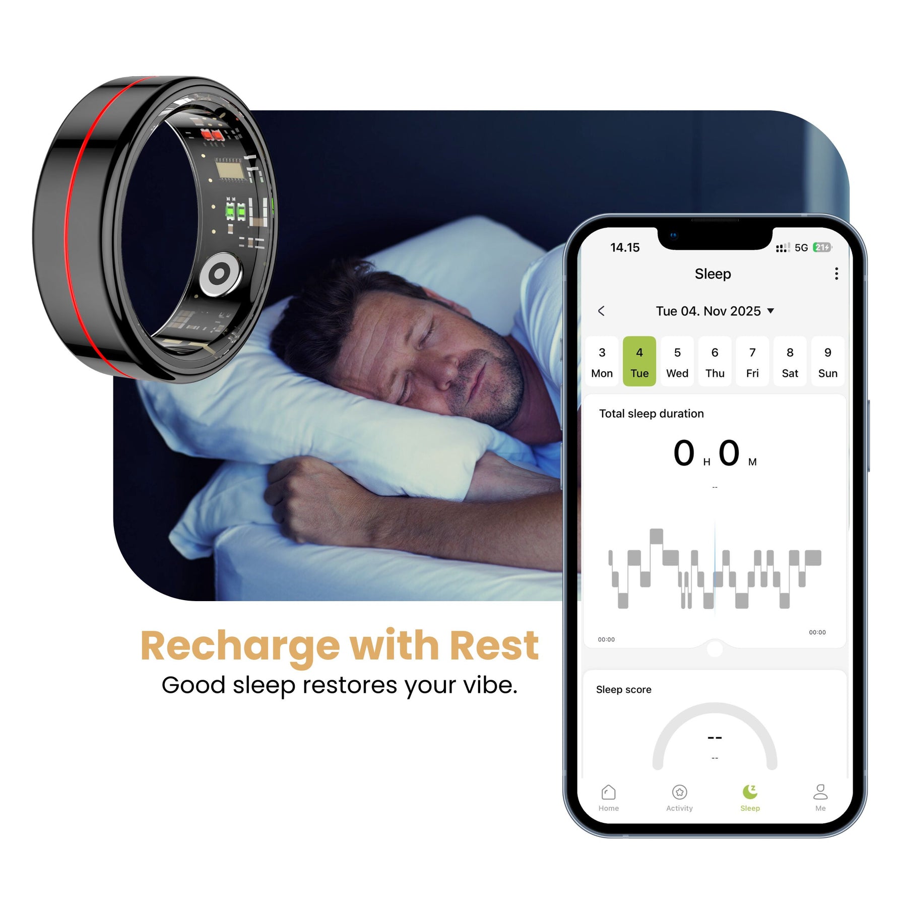 Con un diseño de circuito de muy bajo consumo, el anillo monitoriza continuamente durante 5-7 días con una carga completa. Junto con el estuche de carga portátil de 200 mAh (incluido), la duración de la batería se prolonga hasta 60 días.