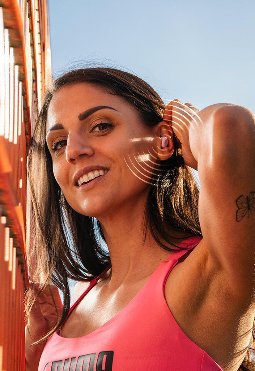 Disfruta de un ajuste y un sonido perfectos sin concesiones. Los auriculares inalámbricos más pequeños del mercado, que combinan un sonido cristalino, un diseño elegante y una comodidad de primer nivel. TinyS permanece en sus oídos en cualquier situación.